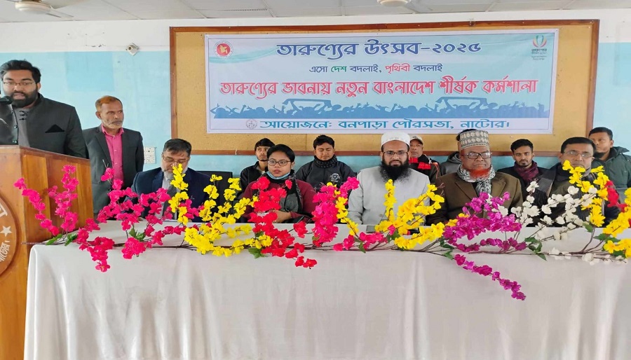 নাটোরের বড়াইগ্রামের বনপাড়া পৌরসভার সম্মেলন কক্ষে তারুণ্যের ভাবনায় নতুন বাংলাদেশ শীর্ষক কর্মশালা অনুষ্ঠিত হয়েছে, এসো দেশ বদলায়, পৃথিবী বদলায়, এই প্রতিপাদ্যকে ধারণ করে বৃহস্পতিবার ( ৯ জানুয়ারী) সকাল ১১ঘটিকায় বনপাড়া পৌরসভার আয়োজনে কর্মশালায় প্রধান অতিথির হিসেবে বক্তব্য রাখেন বনপাড়া পৌর প্রশাসক ও বড়াইগ্রাম উপজেলার সহকারী কমিশনার ভূমি মোঃ আশরাফুল ইসলাম,বিশেষ অতিথি হিসেবে উপস্থিত ছিলেন বনপাড়া পৌরসভার নির্বাহী প্রকৌশলী মোঃ আতাউর রহমান , এছাড়া আরো উপস্থিত ছিলেন ডাঃ সুপ্তি গোমেজ , বনপাড়া আলিম মাদ্রাসার শিক্ষক মোঃ আব্দুল মান্নান তিরাইলি সাহেব, শেখ ফজিলাতুন্নেছা সরকারি অনার্স মহিলা কলেজের সহকারি অধ্যাপক শ্রী গোপাল চন্দ্র, বনপাড়া মডেল উচ্চ বিদ্যালয় সহকারী শিক্ষক মোঃ লুকমান হোসেন প্রামানিক, বৈষম্য বিরোধী ছাত্র আন্দোলনের বড়াইগ্রাম উপজেলা সমন্বয়ক তারুণ্যের অহংকার মোঃ নুহু ইসলাম, সাংবাদিক ও বিভিন্ন কলেজের ছাত্র-ছাত্রী